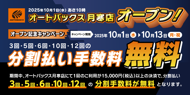 期間中、オートバックス月寒店にて1回のご利用が15,000円(税込)以上で、分割払い「3回」「5回」「6回」「10回」「12回」をご利用いただいた方。