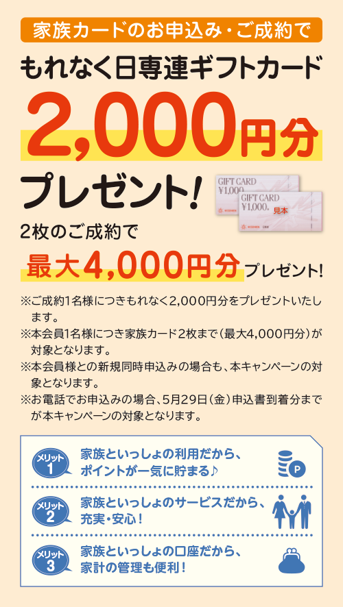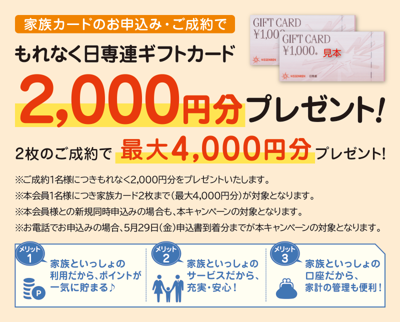 - 家族カードのお申込み・ご成約1名様につき、もれなく「日専連ギフトカード2,000円分」をプレゼント。