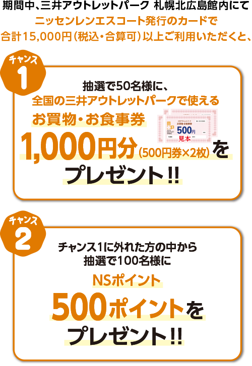 - 全国の三井アウトレットパークで使えるお買物・お食事券は、期間中の三井アウトレットパーク 札幌北広島でのご利用金額を集計し、15,000円(税込・合算可)を1口として抽選いたします。口数は自動集計となり上限はございません。当選者の発表は、賞品の発送をもってかえさせていただきます(賞品は2026年2月中旬〜下旬頃発送予定)。NSポイントは2026年3月発行のご利用代金明細書にてボーナスポイントとして付与いたします。全国の三井アウトレットパークで使えるお買物・お食事券との重複当選はございません。景品表示法の定めにより本キャンペーンに当選された方は同時期実施の他のキャンペーンに当選できない場合がございます。