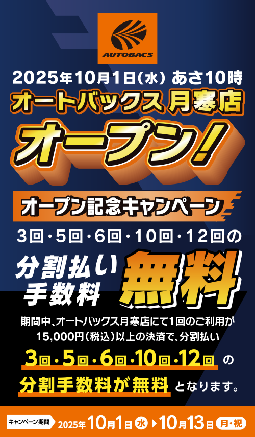 期間中、オートバックス月寒店にて1回のご利用が15,000円(税込)以上で、分割払い「3回」「5回」「6回」「10回」「12回」をご利用いただいた方。