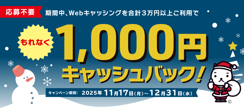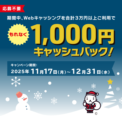 - 期間中、Webキャッシングを合計3万円以上ご利用で、もれなく1,000円キャッシュバックいたします。
