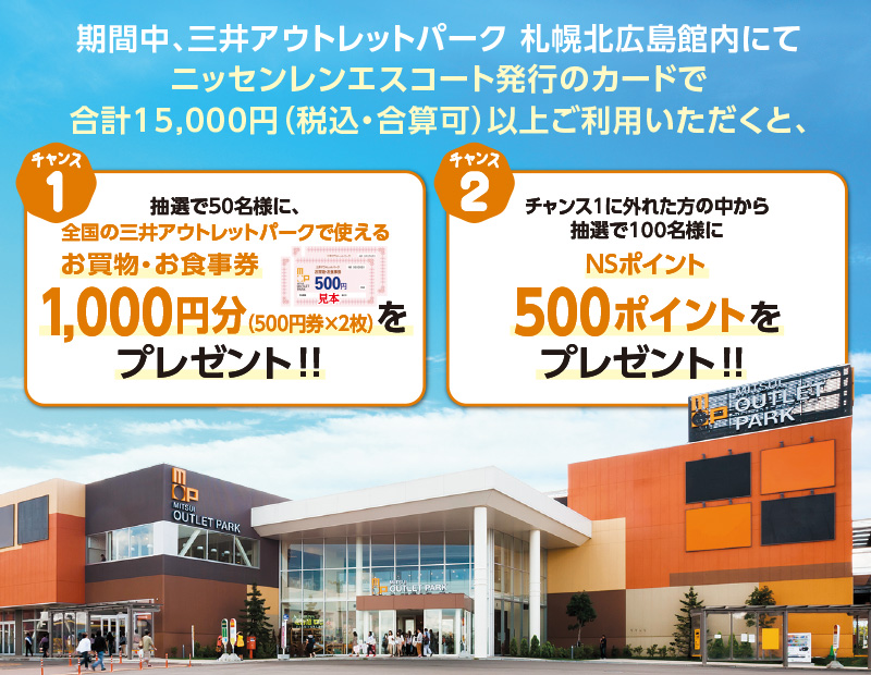 - 全国の三井アウトレットパークで使えるお買物・お食事券は、期間中の三井アウトレットパーク 札幌北広島でのご利用金額を集計し、15,000円(税込・合算可)を1口として抽選いたします。口数は自動集計となり上限はございません。当選者の発表は、賞品の発送をもってかえさせていただきます(賞品は2026年2月中旬〜下旬頃発送予定)。NSポイントは2026年3月発行のご利用代金明細書にてボーナスポイントとして付与いたします。全国の三井アウトレットパークで使えるお買物・お食事券との重複当選はございません。景品表示法の定めにより本キャンペーンに当選された方は同時期実施の他のキャンペーンに当選できない場合がございます。