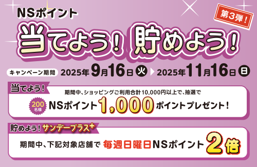 当てよう!期間中、ショッピングご利用合計10,000円以上で、抽選で200名様にNSポイント1,000ポイントプレゼント!
