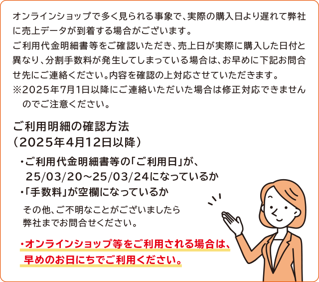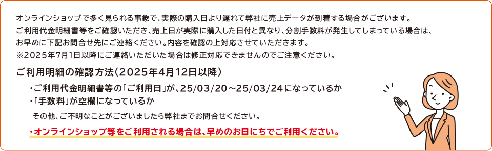 ・ ご利用後、対象の分割払いに変更した場合であっても手数料は無料となりますが、変更締切日がございますので、下記をご覧の上ご注意ください。