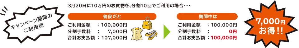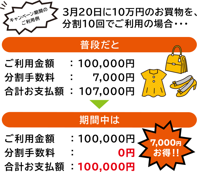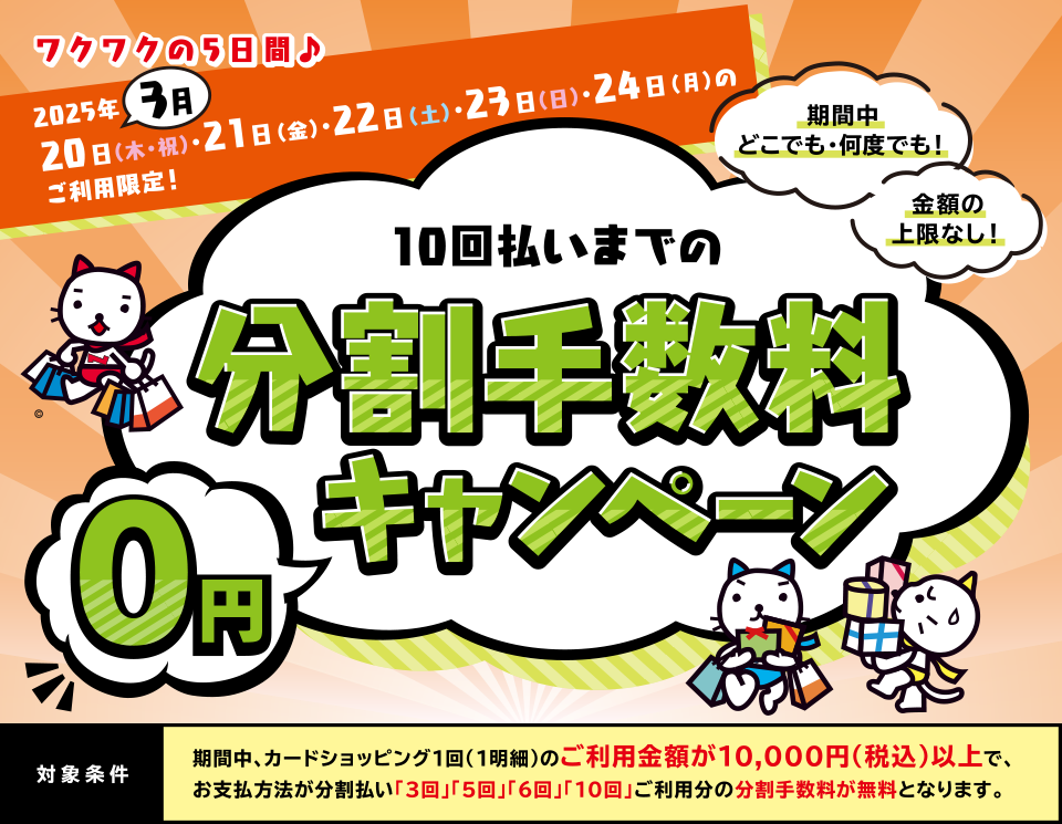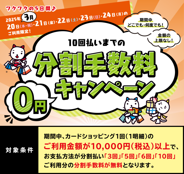 期間中、カードショッピング1回(1明細)のご利用金額が10,000円(税込)以上で、お支払方法が分割払い「3回」「5回」「6回」「10回」ご利用分の分割手数料が無料となります。