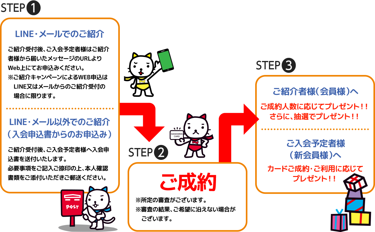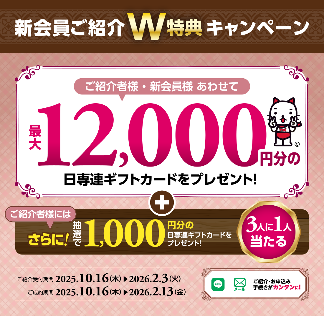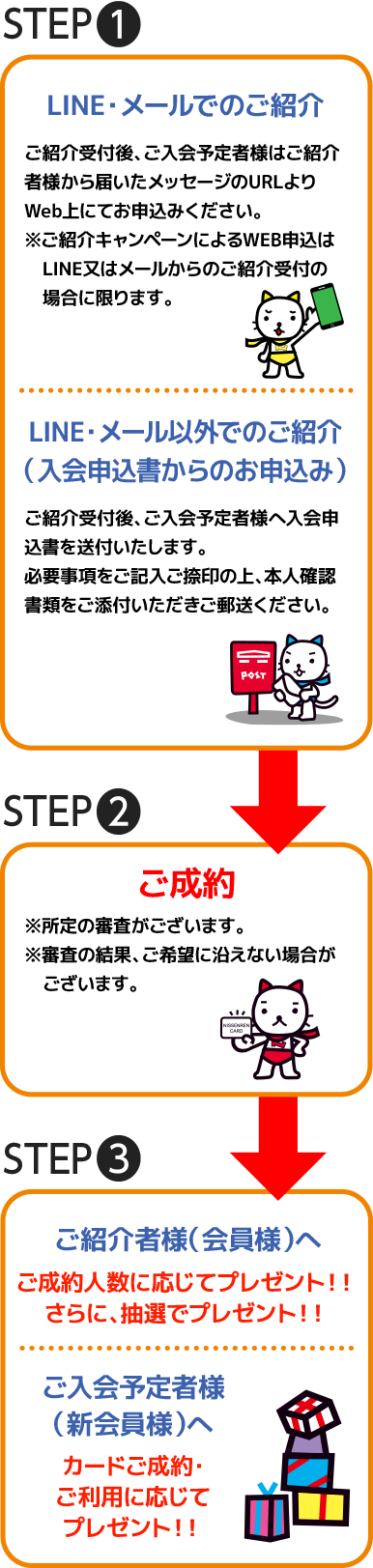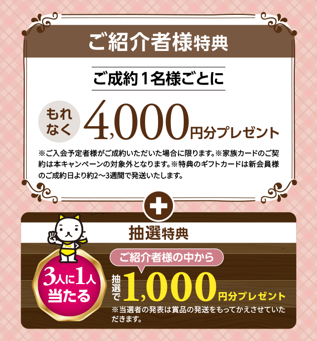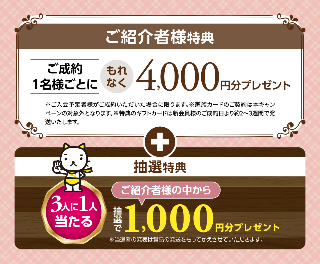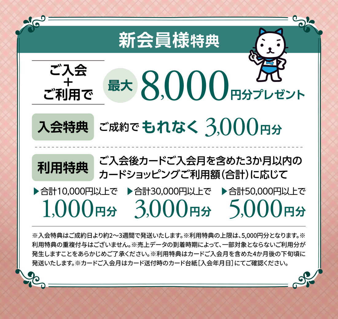 ご紹介者様特典及び入会特典は、新会員様のカードご成約日より約2~3週間で発送いたします。利用特典は、カードご入会月を含めた4か月後の下旬頃に発送いたします。抽選特典は、2026年3月に抽選し、同月下旬頃に当選者へ発送いたします。当選者の発表は賞品の発送をもってかえさせていただきます。 (注意)■特典の発送前にカード契約を退会されている場合につきましては特典付与の対象外とさせていただきますので、あらかじめご了承ください。(※お客様のご契約状況等により特典の付与をお断りさせていただく場合がございます。) ■本キャンペーンは、同時期に実施するその他入会キャンペーンの特典と重複付与することはありません。 |